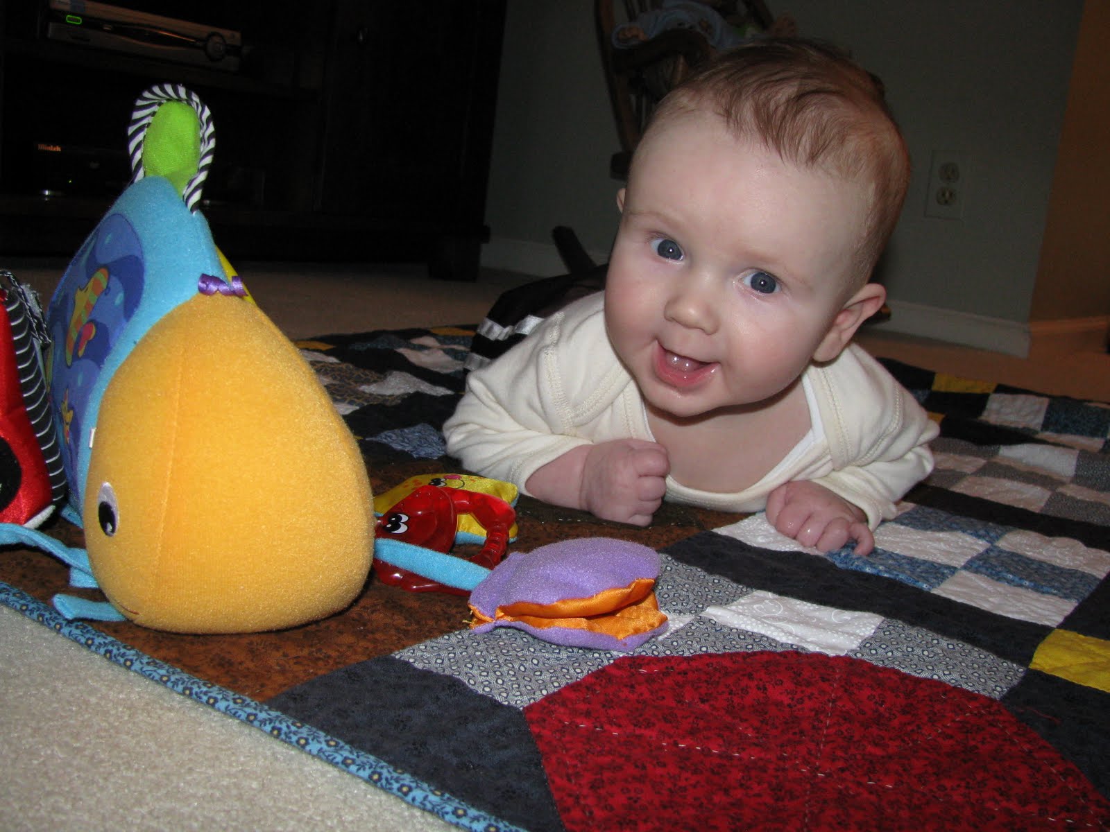Jack is flying through milestones. He smiled for the first time right on cue and then recently he added laughing to his resume. We did get some really cute video of that, but we didn't need to because he'll laugh almost on command. (Its a deep raspy little laugh, but its happy and cute). Then, just yesterday he rolled over. And yes, I missed it. I put him on his back on his blanket with a mirrored toy. Then, I went to help Lilly in the potty. When I got back Jack was on his tummy, up on his elbows and grinning from ear to ear. He obviously knew he had done something special and was very proud of himself.